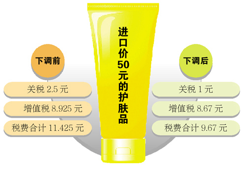 广州市众上日化有限公司总经理张碧华在接受本报记者采访时介绍,一般进口化妆品包括关税、17%的增值税、30%的消费税,护肤品在2006年已取消了消费税。如果一款进口价50元左右的护肤品,其来到消费者手中要缴纳关税2.5元(按先前的5%计算)、增值税8.925元(计算公式为50×1.05×0.17),这样下来税费合计11.425元,而按照本次下调之后的2%的关税税率来算,这两项税费为9.67元,实际降了2元左右。