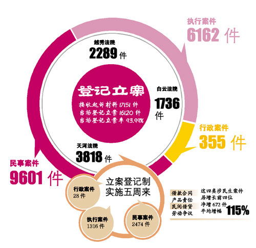 天河区人民法院副院长蒋伟透露,今年1~5月,天河法院立案数为13788件,其中,5月份立案数占27.6%。数据显示,立案登记制实施五周以来,天河法院受理案件3818件,其中民事案件2474件,行政案件28件,执行案件1316件,案件同比增幅26%。民事案件中,借款合同、产品责任、民间借贷和劳动争议四类涉民生较强的案件高居案件增长前四位,净增672件,平均增幅115%。蒋伟表示,从数据上可以看出,民众运用法律维护自身权益的意识逐步增强。