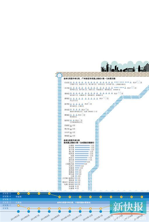 去年5月,广州主要河涌水质状况发布系统进行了“改版”,新增10条河涌;公布的60条河涌分为64段,分布于广州市12区市。而根据去年5月广州河涌水质状况月报,天河、白云、越秀、海珠、黄埔、花都六个区内均有河涌水质未达标,其中天河区有6段河涌水质未达标,白云区、越秀区、海珠区、黄埔区、花都区各有7段、3段、7段、5段、6段。