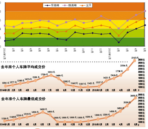 “外地车”攀升,直接导致中心城区拥堵升级。中心城区全天交通拥堵指数(TPI)在最近的16个月内呈攀升趋势:2014年1月的早晚高峰及全天拥堵指数分别是1.23、4.72、2.97;到了2015年5月升级为4.83、8.02、6.43。