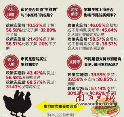 国家统计局中山调查队在政策实施前和实施一周后,抽选了东区、石岐区部分人流较大的农贸市场及超市周边,以随机访谈的形式收集了222位市民的意见。调查发现,随着政策实施,市民对生鲜禽类接受度逐渐提高,但传统饮食习惯一时很难适应新变化,尤其是购买过生鲜禽类的市民有六成认为其口感“不如活禽”。