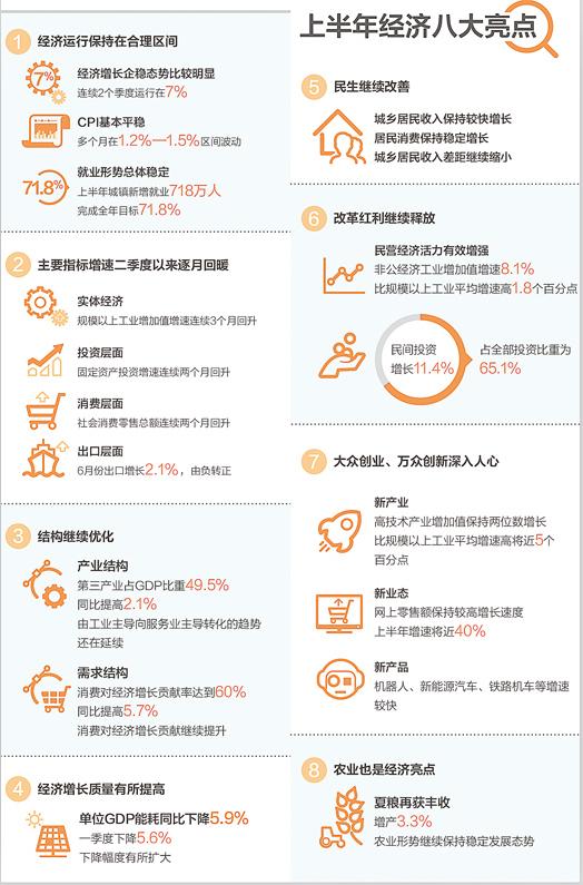 第七,大众创业、万众创新深入人心,新产业、新业态、新产品在快速成长。从新产业角度来说,高技术产业的增加值仍然保持两位数的增长,比规模以上工业平均增速高将近5个百分点。从新业态的角度来看,网上零售额继续保持较高的增长速度,在过去两年连续高增长的基础之上,今年上半年增长速度将近40%。新产品也不断涌现,像机器人、新能源汽车、铁路机车增长速度有的在翻倍,有的在50%以上。