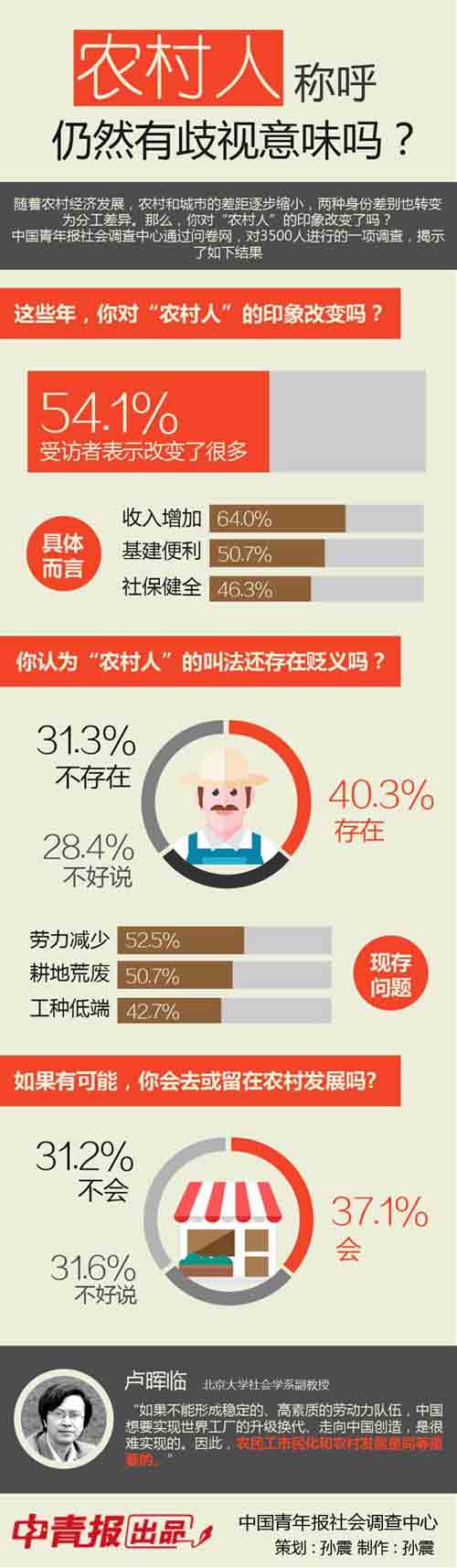 近日,中国青年报社会调查中心通过问卷网,对3500人进行的一项调查显示,这些年来,51.2%的受访者对“农村人”的印象改变了很多,然而,也有40.3%的受访者认为,“农村人”的叫法仍然存在歧义,53.9%的受访者认为“农村人”和“城里人”差距仍然很大。