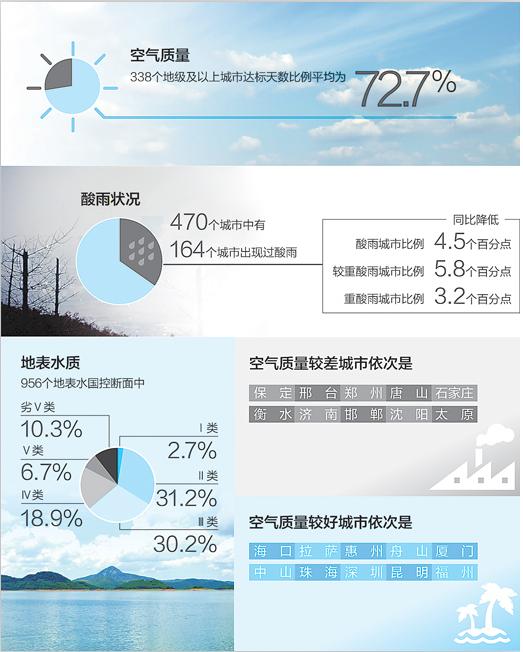 据环保部环境监测司司长罗毅介绍,2015年上半年,国家环境监测网继续开展环境空气、酸雨、地表水等各环境要素监测。按照《环境空气质量标准》,全国338个地级及以上城市达标天数比例平均为72.7%,其中轻度污染比例为18.7%,中度污染占5.2%,重度污染占2.7%,严重污染占0.7%。首要污染物为PM2.5。