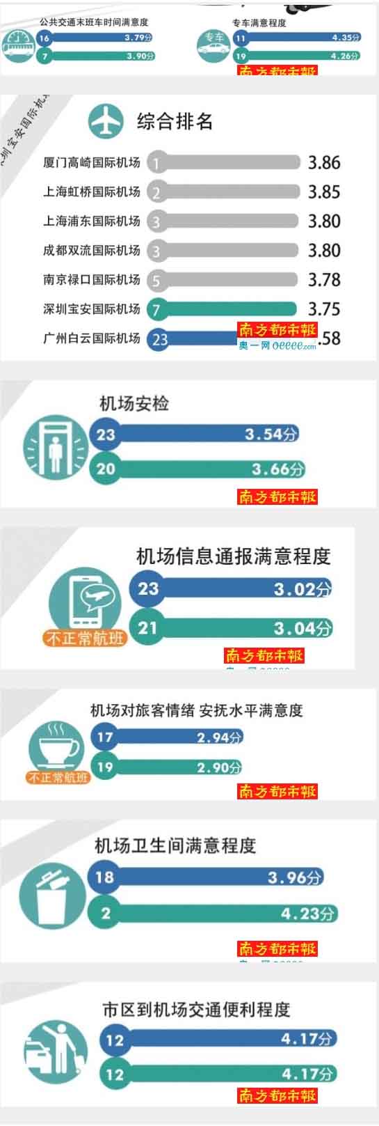 从第一第二季度评分结果看,旅客对广州白云机场和深圳宝安机场不正常航班机场地面服务满意度的四个指标均低于平均分。从部分参与第一第二季度调查问卷的旅客留言来看,也多与飞机延误有关。“航班延数小时后。因技术故障取消航班。已经是夜间12点。安排的酒店远,环境也差。”一名白云机场旅客如此留言,“无论是谁的问题,(因飞机延误)这次旅行没有一个完美的Ending”。另外一名白云机场旅客,也对飞机无限延误感到无奈。
