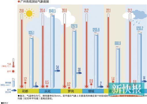 其实,广州市气温与降雨数据没有按区市进行统计。广州市气象局解释,番禺、花都、从化、广州(萝岗)、增城5个站点是广州市国家地面气象观测站,建站时间都在30年以上,观测场环境比较有代表性。而中心城区总面积不大,占的权重不能太大,因而通常只用上面5个站点数据代表全市的平均值,这样更合理一些。