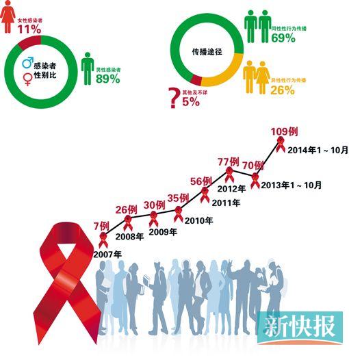 新快报记者昨日还从广州市疾控中心日前公布的数据获悉,广州自2002年发现首例青少年学生艾滋病病毒感染者以来,截至2014年12月31日,累计报告病例231例,报告数以年均增长46.37%的速度快速上升。