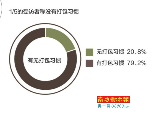 凯迪数据研究中心的《文明广州2 .0之文明食和行调查报告》显示,79.2%受访者有餐后打包剩菜的习惯。