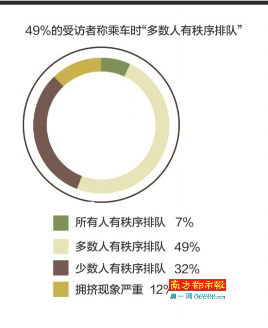 凯迪数据对文明出行的调查中发现,49%的调查者称乘车时“多数人有秩序排队”。报告称,广州市民的乘车礼让、文明出行程度较高。