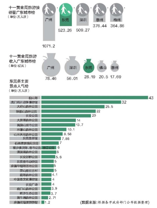 南都记者根据各市政府的旅游部门公布的数据,整理了广东18个主要城市的黄金周旅游数据排行榜。其中显示,东莞的接待游客数量排在第二位,仅次于广州市,而超过了深圳市。东莞的旅游经济总量已连续三年稳居全省第四,仅次于广州、深圳和佛山之后。而在此次黄金周的排名中,东莞跃居第二,可以窥见东莞在发展旅游方面正在发力且有所成效。