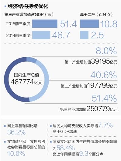 首先,产业结构的调整在继续推进,产业结构在继续优化,突出表现在服务业增长较快,产业结构由原来的工业主导向服务业主导转变的趋势更加明确。前三季度,第三产业增加值占国内生产总值的比重为51.4%,高于第二产业10.8个百分点。内需结构进一步改善。前三季度,最终消费支出对国内生产总值增长的贡献率为58.4%,比上年同期提高9.3个百分点。城乡居民收入差距进一步缩小。前三季度,农村居民人均可支配收入实际增长快于城镇居民人均可支配收入1.3个百分点,城乡居民人均收入倍差2.83,比上年同期缩小0.03。节能降耗继续取得新进展。