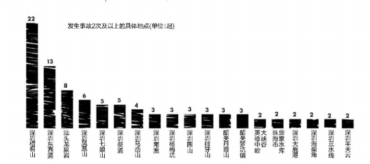 南都记者不完全统计2010年-2015年发生在广东的170起户外安全事故,涉及1245人,伤亡161人,其中死亡事故25起,死亡人数32人。从事故发生城市看,170起事故中,在深圳的有87起,其次是韶关、汕头、广州等地。