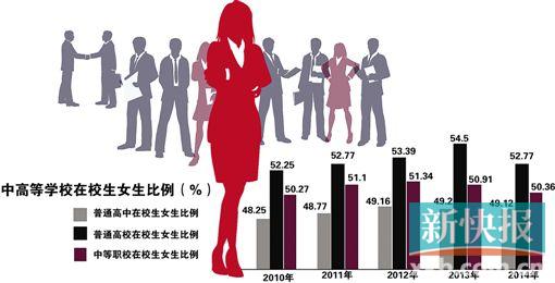 再从直接影响就业层次、结构的教育层面看,相较于普通高中、中等职校的在校女生数量而言,2010-2014年间,普通高校的在校女生的比重一直领先,而且以平均53.136%,不低于52.55%的比重,远超男生。