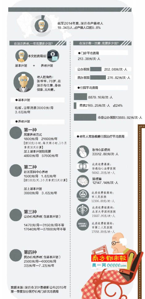 截至2014年底,深圳市户籍老人19 .34万人,占户籍人口的5 .8%。作为移民城市,虽然深圳市目前还未进入老龄化社会,但随着第一代来深建设者逐步迈入老年,新移民家庭的逐步稳定带来随迁老人的日趋增多,人口老龄化成为必然趋势。目前深圳人均基本养老金约为3500元/月,一个有房的老人还能维持基本生活水平,但相比之下看病支出可谓高昂:门诊每人每次平均200多元,住院平均近9000元,而脑梗塞、心肌梗死等老年人常见疾病的住院治疗费用每人每次平均1.2万-3万多元,个别医院高达五六万元。