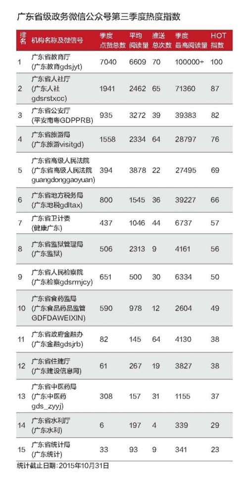 踏入第四季度的今天,我们继续推出广东省级政务微信号第三季度热度指数排行榜。新开通尚不满一个季度的政务微信,此次统计没有计入。