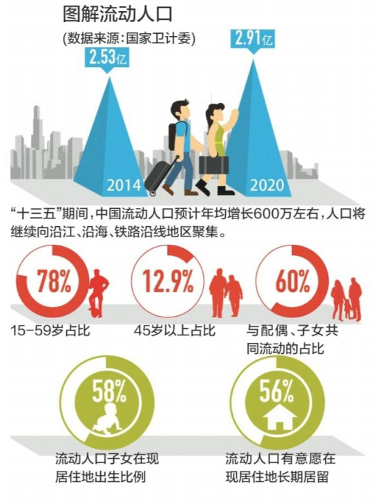 国家卫计委流动人口司司长王谦介绍,2014年年末,中国的流动人口达到2.53亿人,到2020年,中国流动迁移人口(含预测期在城镇落户的人口)将逐步增长到2.91亿人。