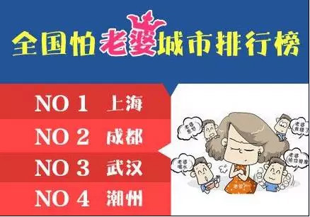 近日,一份“妻管严”城市排行榜在网上流传,前十名的城市依次为:No.1上海;No.2成都;No.3武汉;No.4潮州、No.5杭州、No.6苏州、No.7宁波、No.8福州、No.9南京、No.10青岛。广州居然没上榜!其实广州的夫妻恩爱不是说怕老婆,而是懂得包容与迁就。家和万事兴,夫妻间的和睦对家庭的影响是很大的哦。(来源: 广州日报)