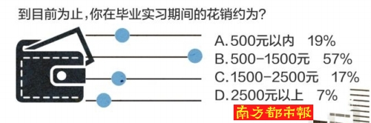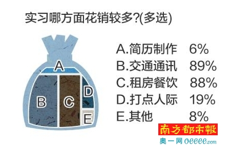 数据显示,近八成受访毕业生实习期间花销不到1500元,其中57%的受访者花销在500元到1500元不等。其中,交通出行和电话通讯是毕业生实习期间花钱最多的地方,占89%;其次是租房餐饮,占88%。