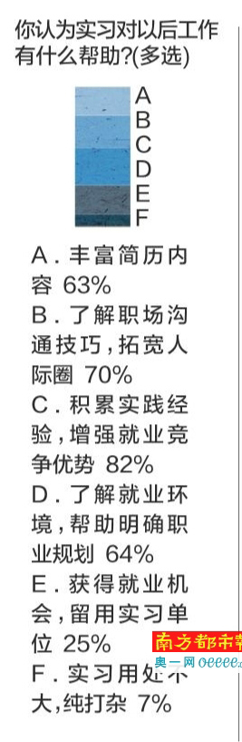 数据显示,跟小希一样,87%的受访应届毕业生对毕业实习都是满心积极,希望从中多多学习知识、积累经验。对于实习对个人的帮助,82%的受访者一致认为实习有利于自身积累社会实践和经验,为日后正式就业增强竞争优势;70%的受访者则认识到,实习期间能帮助自己更多了解职场的沟通技巧,拓宽“朋友圈”。
