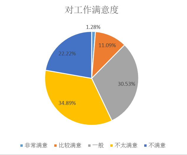 其中,35岁以下青年法官有1250人,占46.99%,35至50岁的中年法官有1301人,占48.91%,50岁以上老年法官有143人,占5.38%,法官平均年龄仅为38岁。胡昌明得到的问卷结果显示,被调查的法官中,只有12.37%的法官表示非常满意或比较满意目前的工作状态,其中表示非常满意的只占1.28%,比较满意的占11.09%;评价为一般的占30.53%;感觉不太满意和很不满意的分别为34.89%、22.22%,两者合计高达57.11%。这意味着近六成被调查法官不满意目前的工作状态。