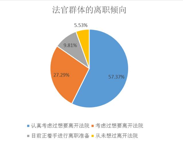 问卷调查结果还显示,在这些因素作用之下,法官群体的离职倾向强烈,94.47%的法官考虑过要离开法院,其中57.37%的法官认真考虑过想要离开法院,而目前正着手进行离职准备的也有9.81%,从未想过离开法院的仅占5.53%。胡昌明认为,虽然目前正着手离职的法官比例不算太高,但是这些年富力强的骨干法官的流失将会给法院带来巨大的冲击。而优秀甚至合格法官的培养不是一朝一夕能够完成的,法官大量流失的后果将十分严重。