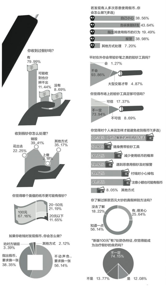 2015年版第五套百元新钞已在各银行发行,纸币主色调、主图案、尺寸规格与上一版一致,但防伪性明显提升,引起了人们对假钞的关注和议论。“新版100元”是治疗假钞的一剂良药吗?收到假钞的人会怎么处理?近日南都联合大粤网、西子湖畔进行网络调查,共收到472份问卷。统计数据显示,79 .99%受访者收过假钞。新钞共有7处防伪特征,74 .15%受访者认为“新版100元”不能成为治疗假钞的良药。
