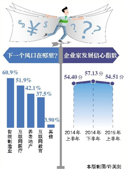 昨日,民生银行联合清华大学民生经济研究院首次对外发布《中国企业家发展信心指数报告》。报告显示,企业家总体对宏观经济充满信心,对政府提倡的“互联网+”行动和“大众创业、万众创新”等经济政策表示认同和支持,超六成企业家认为,下一个风口将会出现在智能制造业。