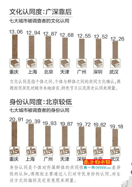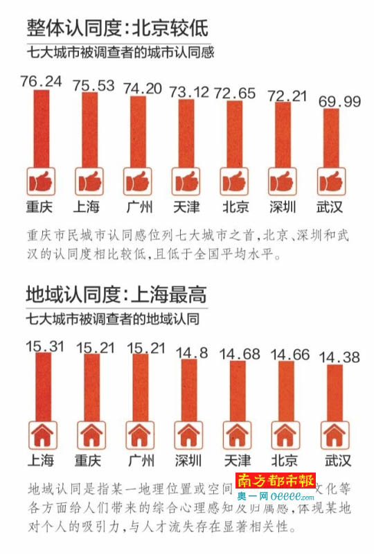 2015年《社会心态蓝皮书》昨日出炉,其中由中国社会科学院社会心理研究中心与凯迪网络共同发布的《中国超大城市认同感调查报告》显示,7个超大城市中,重庆整体认同度最高,上海地域认同度最高、人才吸引力最强,而北京认同度相比较低。