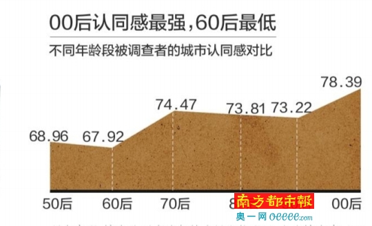 调查发现,城市认同感的年龄分层比较明显,七大城市中,“50后”与“60后”城市认同感最低,而“00后”城市认同感最高。