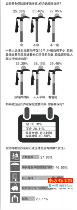目前养老保险的最低缴费年限为15年,即必须满180个月。随着养老金并轨和延迟退休政策的执行和明确,养老保险改革已进入深水区,养老保险最低缴费年限成为业内参与改革问题讨论人士的关注重点。如果养老保险缴费年限延长,你支持吗?如果多缴多拿,你会多缴吗?连日来,南都通过大粤网、西子论坛进行网络调查,共收到1059份调查问卷。结果显示,84 .80%的受访者称自己已经买了养老保险。面对养老金缴费年限的问题,九成受访者反对延长缴费年限,有三成以上受访者表示会弃保,近五成受访者表示会慎重考虑,如果不划算或许会弃保。