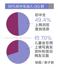 记者了解到,家长对孩子的网络生活的担忧主要为:担心耽误学习,担心影响视力与接触不良信息。事实上,调研报告指出,儿童在线的风险主要表现为儿童不重视个人隐私保护,近七成的儿童会在网上不加分辨填写真实资料和答应网友的线下见面要求,同时,约70%的儿童会遭到黄色、暴力等不良信息的侵害。