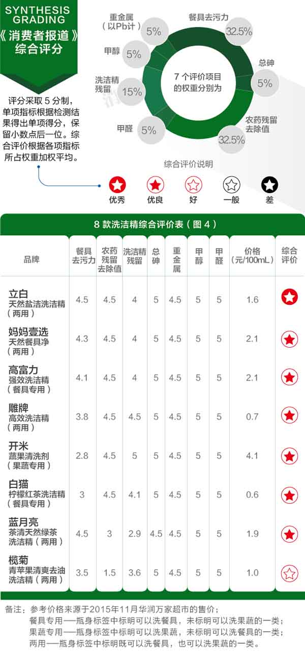 从消费者角度出发,洗洁精的去油污除农残的效果所占权重较高,而洗洁精残留量在安全指标之中是更为重要的一个;因此本刊以去污力占65%(餐具去污力与农药残留去除值各占32.5%),洗洁精残留量占15%,其余4项安全指标各5%的权重进行评分。