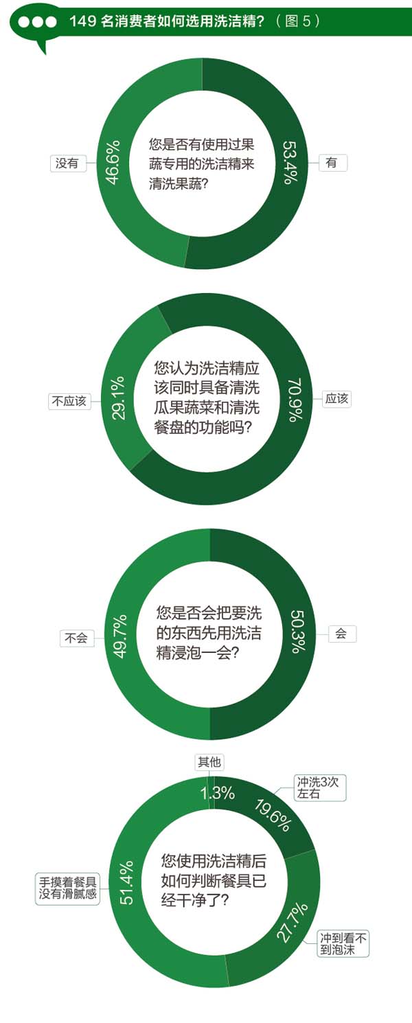 年10月,《消费者报道》对149名消费者有关洗洁精的问卷调查结果显示,50%的消费者在使用洗洁精时,会把要洗的东西先用洗洁精浸泡一会,甚至认为浸泡时间越长,清洁效果会越好。