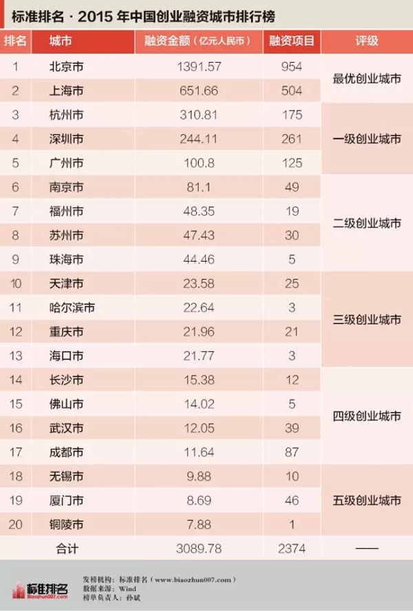 在标准排名“2015年中国创业融资城市榜”上,排名第一的北京全年融资项目954个,融资额高达1392亿元;第二位上海,504个项目融资652亿元。上文中曾提到,2015年全年的项目是2700个,融资总额3222.5亿元,北京、上海两个城市的融资项目和融资金额分别占到全部总数的54%和63%。排名3~5位的则是杭州、深圳和广州。上述城市也是2015年创业融资额在百亿元以上仅有的5个城市。