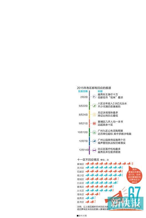此次新快报记者对于各区回应情况的统计梳理,是从2015年1月5日至2016年1月4日为时间段,以《广州区势》已见报的报道为准。在采写这些报道时,记者会至少提前一周向各区提出询问。