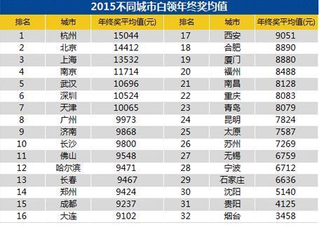 近日,智联招聘发布了《2015年白领年终奖调研报告》,该报告基于智联招聘2015白领年终奖调研数据库的数据监测统计分析,计算出2015年我国主要32个城市年终奖的平均值,并根据平均值列出年终奖排行榜如下表: