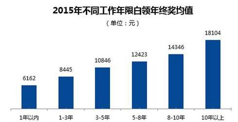 看完各城市年终奖平均值,我们再来看看报告里提及的不同工作年限的白领在2015年领取的年终奖平均值: