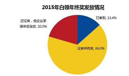 虽说工作时间越长领取的年终奖越多,但并不是所有白领都能领到年终奖。根据智联招聘2015白领年终奖调研数据库的数据监测统计,参与调查的白领中已经拿到年终奖的比例仅为13.4%,20.5%的白领表示企业承诺年后发放,总体来看,2015年能拿到年终奖的白领占比仅为三分之一,白领年底的年终奖收入不太乐观。