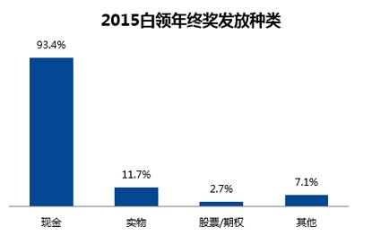 而在会发放年终奖的这三分之一白领中,有93.4%的白领表示会拿到现金形式的年终奖,11.7%的白领将拿到实物形式的年终奖,另外还有2.7%的白领表示企业会以发放股票/期权的方式作为年终奖。相比实物和股票/期权,还是现金形式发放更多的被采用。(来源:融360)