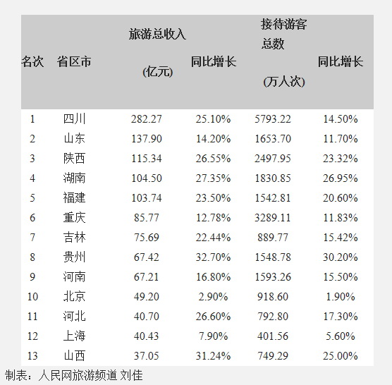 说明:本表采用的是各省区市旅游局公开统计数据,各省市区统计涵盖范围或有不一,若有出入请及时与人民网旅游频道联系。联系电话:010-65368440(来源:人民网-旅游频道 作者:刘佳)
