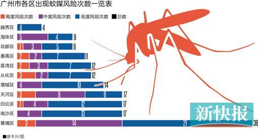 那么,市民因被蚊子叮咬而患病的风险到底有多高呢?新快报记者了解到,此前针对同样由蚊子传播的登革热,广州市疾控中心每周都会通报各区蚊媒密度较高的街镇名单,而记者近日对广州市疾控中心公布于官网的蚊媒密度监测结果进行统计,发现黄埔区的街镇被点名次数最多,合计达38次,而最少的越秀区只有4次。
