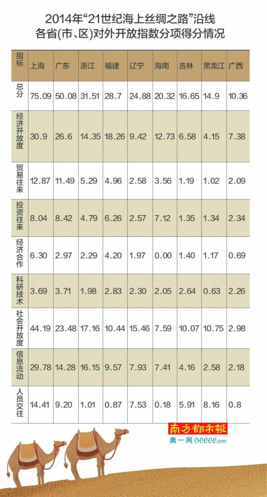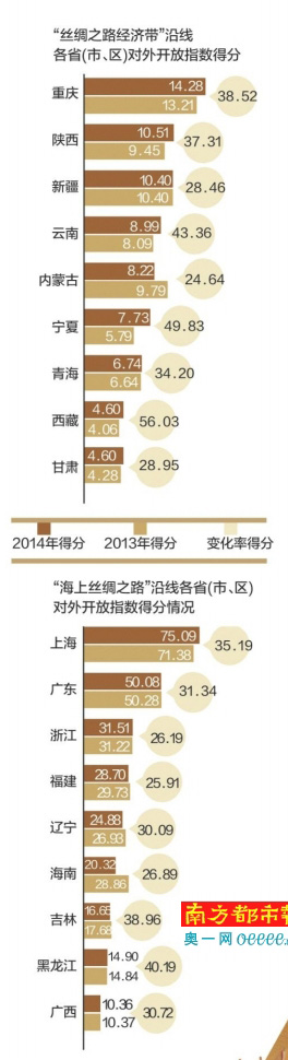 《报告》中指出,2014年排在首位的上海得分为75 .09,广东名列第二,得分50 .08。“一路”各地2014年表现按得分高低的排序依次是:上海、广东、浙江、福建、辽宁、海南、吉林、黑龙江、广西。