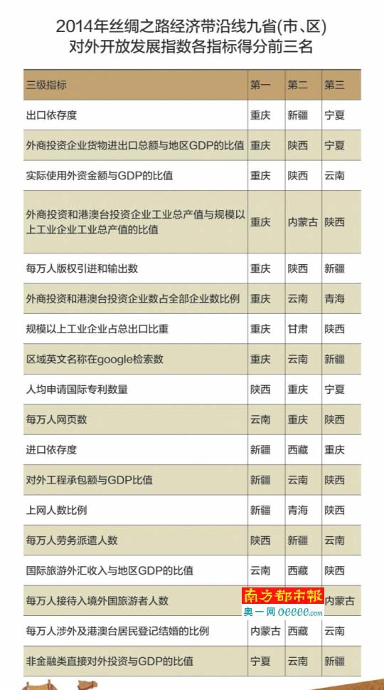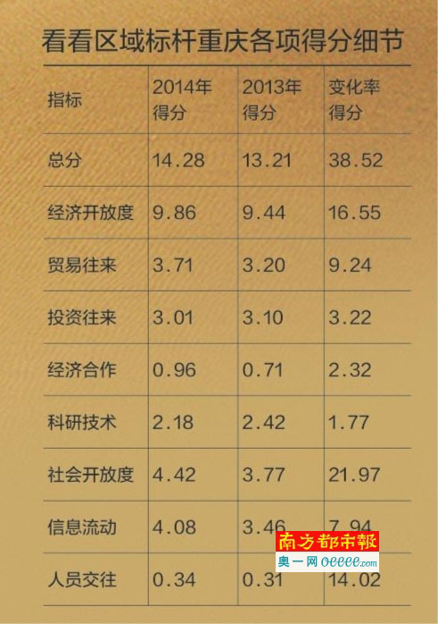 《报告》通过指标体系测算发现,2014年,重庆对外开放发展指数总得分14 .28分,总体表现在丝绸之路经济带沿线九省(市、区)中位居首位。