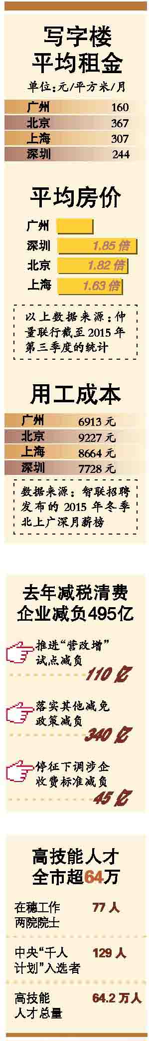 2015年,广州通过减税清费措施为企业减负约495亿元(全口径,含中央库、省库和市库收入),其中推进“营改增”试点减负约110 亿元;落实其他减免税政策减负约340亿元;停征和下调涉企收费标准等减负约45亿元。同时,全面停征堤围防护费,取消和停征保存人事关系及档案费等56项行政事业性收费,降低住房转让手续费等12项行政事业性收费标准。