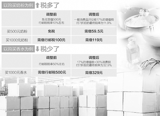 以普通的奶粉为例,此次政策调整前,一次购买500元的奶粉可以免税;政策调整后,需按11.9%的税率缴税,即59.5元。如果一次购买1000元的奶粉,原来按照行邮税需缴税款100元,政策调整后,缴纳增值税为119元。