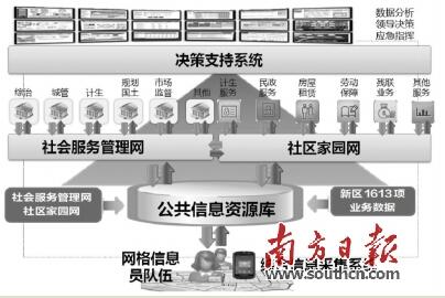 在信息采集有保障的前提下,坪山打破了部门数据壁垒,建立起公共基础信息资源库,集成30多家市直单位和所有区直部门、2个办事处23个社区的数据,纵向实现了市、新区、办事处、社区四级联通,横向实现了各部门的信息贯通,政务信息系统架构由“川”字形改造成为“井”字形的架构。