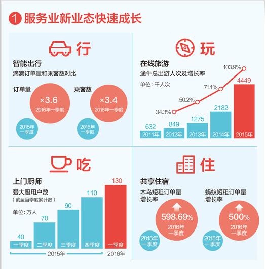 从数据来看,一季度,社会消费品零售总额增长10.3%,显得较为平稳。不过,另一边,服务业新业态成长迅速,新模式不断涌现并发展壮大。比如,在智能出行领域,滴滴出行今年一季度订单量、乘客数都增加2倍多。在线旅游领域,2015年途牛旅游网的总出游人数和交易额增长各翻一番。上门服务与短租领域发展更是迅猛,今年一季度,蚂蚁短租的订单量与房源量增长500%,木鸟短租的订单量增长598%,爱大厨日单量更是去年同期的7倍。得益于移动互联网的普及,不少服务业新业态在短时间内吸引了大量“粉丝”。