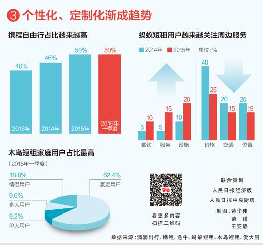不仅旅游不再跟团走,旅游的住宿方式也从传统的住宾馆酒店渐渐转向短租。蚂蚁短租数据显示,相比2014年,自由行用户对于住宿产品价格、位置、交通的关注都出现一定程度下降,而对餐饮、服务和设施的关注都在较大幅度地提升。在木鸟短租的房客类型分布中,家庭用户目前占到62.4%。从自由行到自由住,一家人在一个陌生城市找个温馨小家度度假,这般自在,想想都惬意!