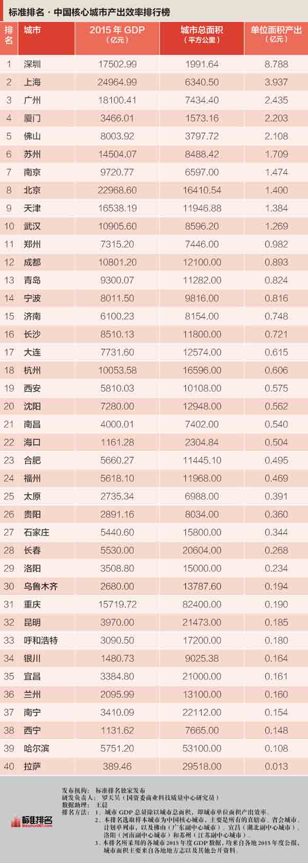 本排名计算方法是:1、城市GDP总量除以城市总面积,即城市单位面积产出效率;2、本排名选取样本城市为中国核心城市,主要是所有的直辖市、省会城市、计划单列市,以及佛山(广东副中心城市)、宜昌(湖北副中心城市)、洛阳(河南副中心城市)和苏州(江苏副中心城市)。3、本排名所采用的各城市2015年度GDP数据,均来自各地2015年度公报,城市面积主要来自各地地方志以及其他公开资料。(罗天昊,国资委商业科技质量中心研究员)(来源:标准排名)