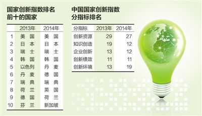 “创新环境是提升国家创新能力的重要基础和保障,2014年中国创新环境排名第十九位,较上年下降6位,需要引起关注。”武夷山说,其中的“宏观经济环境”“政府采购对技术创新影响”“政府规章对企业负担影响”三项指标排名仍然稳居前列,分别为第四、第四和第九位。这表明中国具有良好而稳定的市场和政策环境。“企业创新项目获得风险资本支持的难易程度”下降幅度较大,从第五位下滑至第十一位。这意味着随着我国创新创业的兴起,企业对风险资本的需求日益迫切,资本市场供给能力有待提高。“知识产权保护力度”也有一定程度的下滑,从第二十五位下降至第三十二位。随着专利产出的快速增长,社会对知识产权保护的需求越来越强,政府保护知识产权的力度还有待进一步提升。